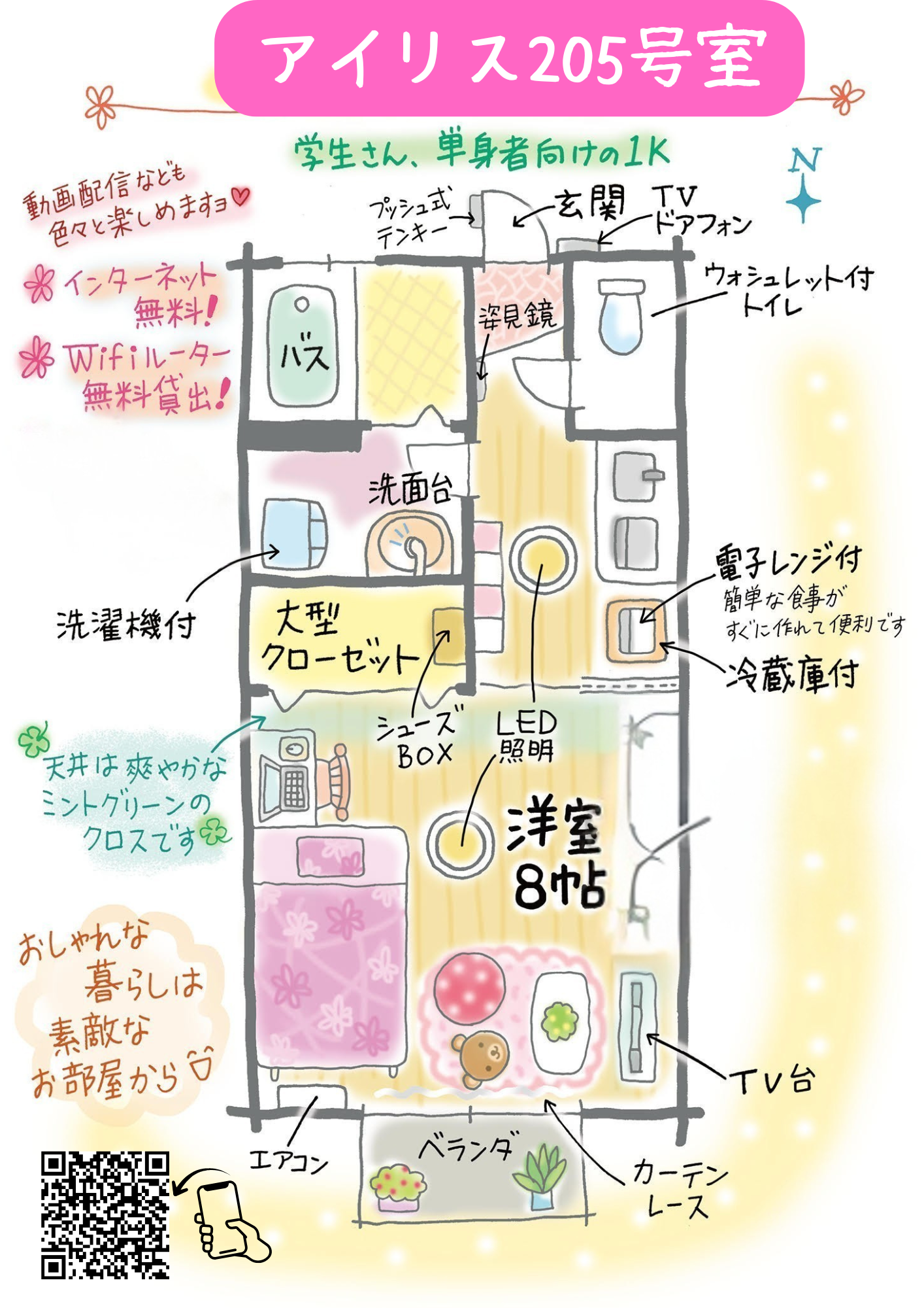 大型本棚、エアコン完備、冷蔵庫、電子レンジ、LED照明、カーテン付。